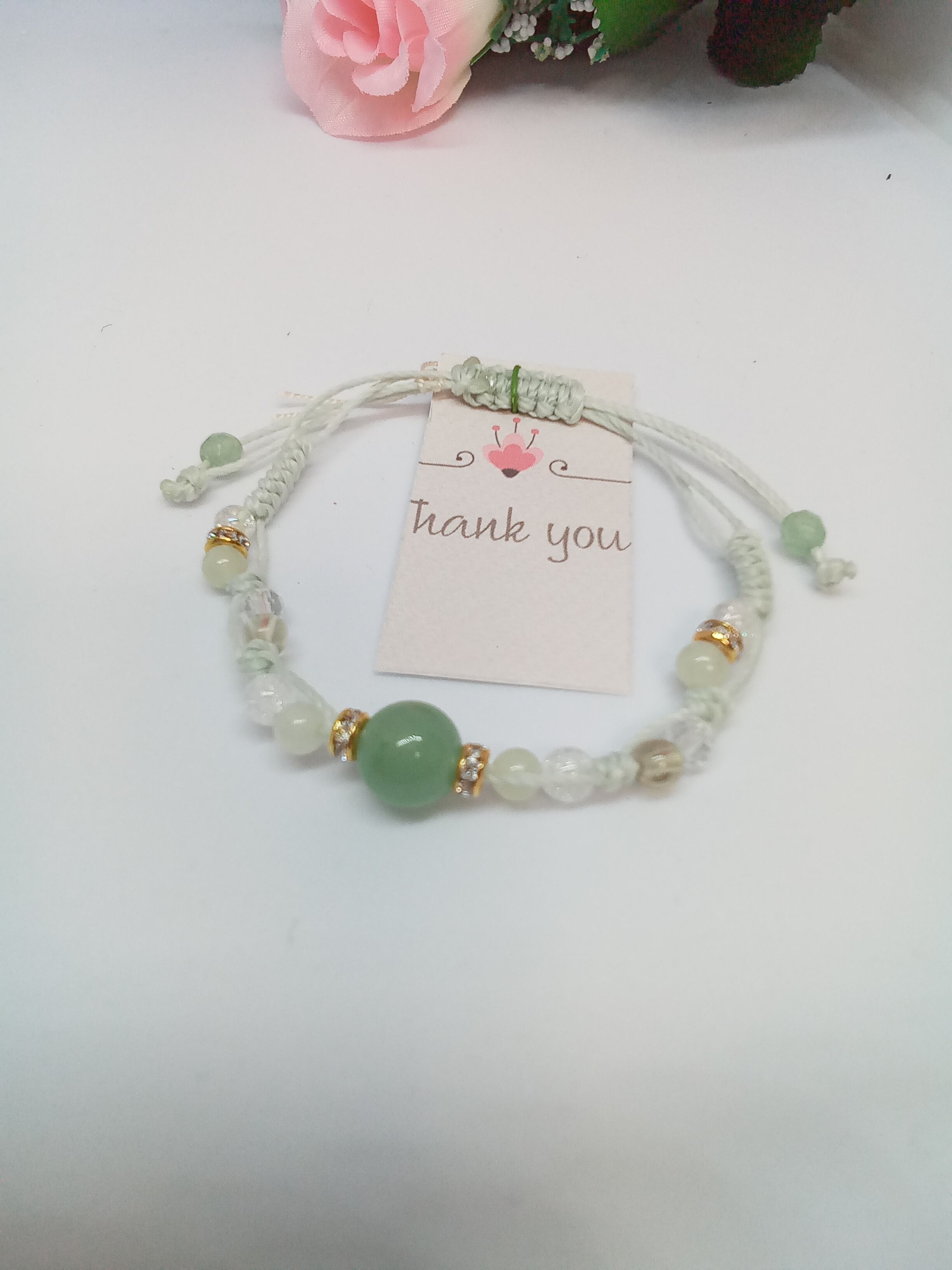 真ん中に8ミリのアベンチュリンをあしらい、周りをクオーツ、ひすいで飾りました。