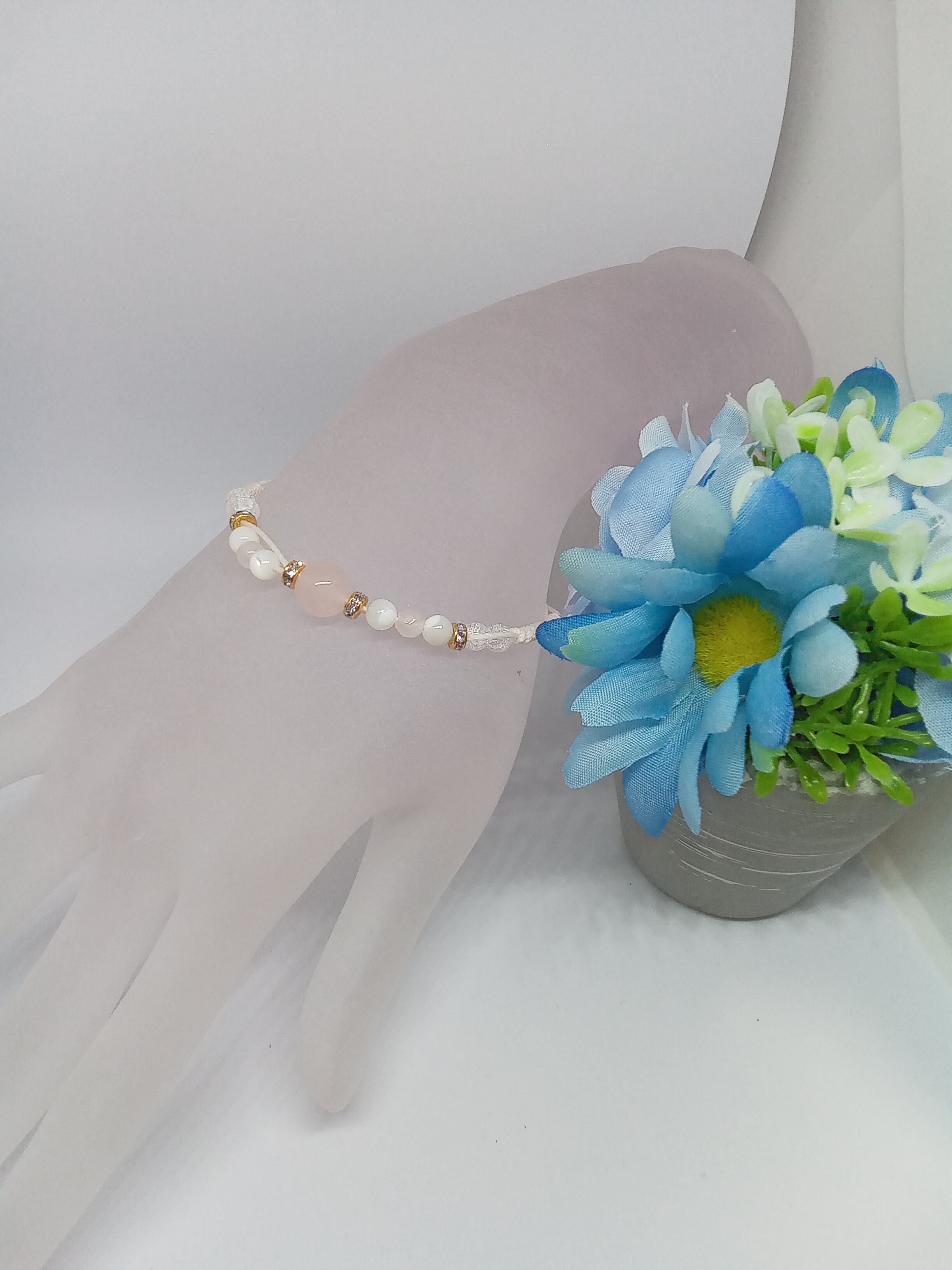 ローズクオーツを真ん中にあしらい、周りをクオーツ、マザーオブパールで囲みました。