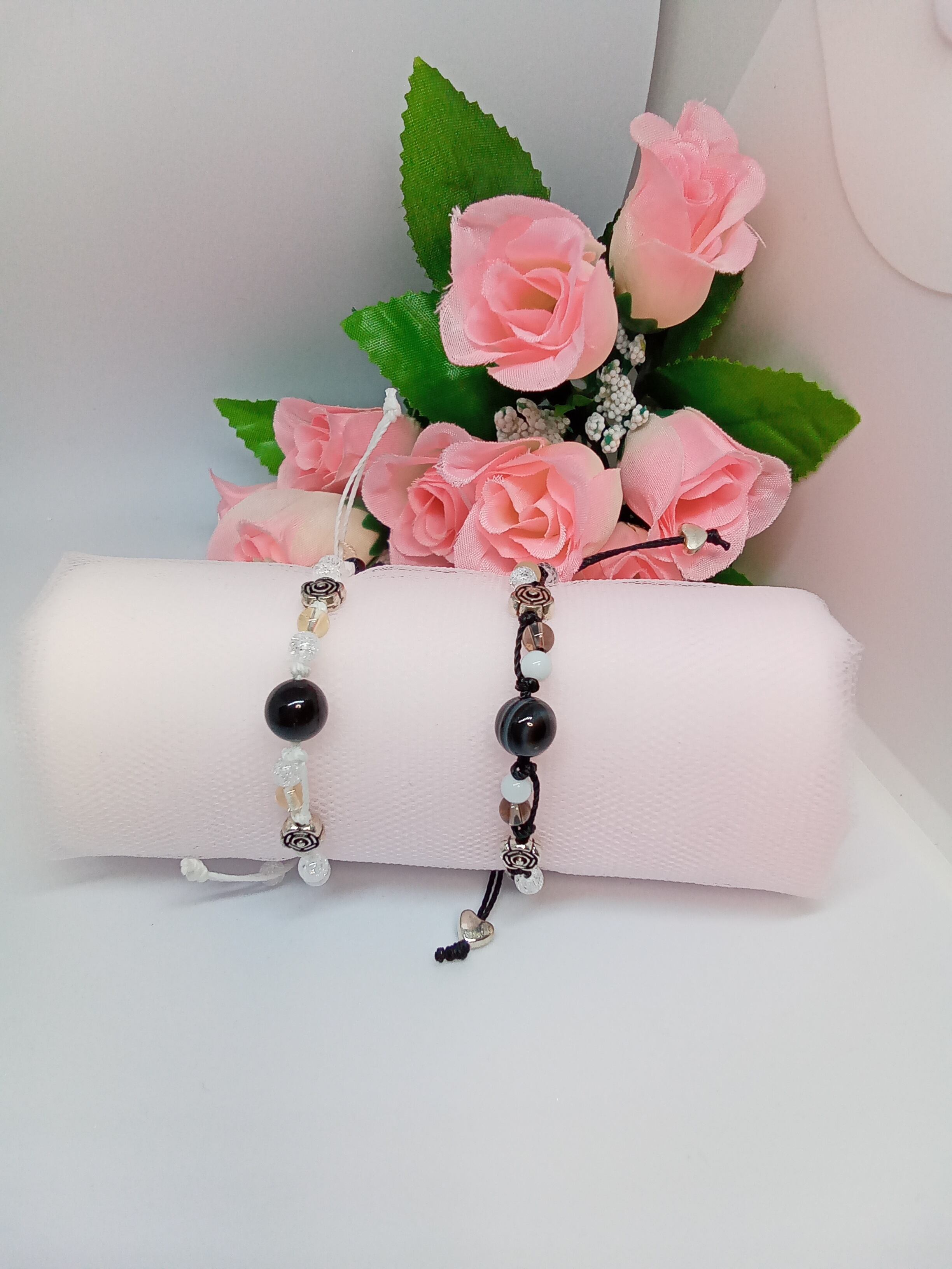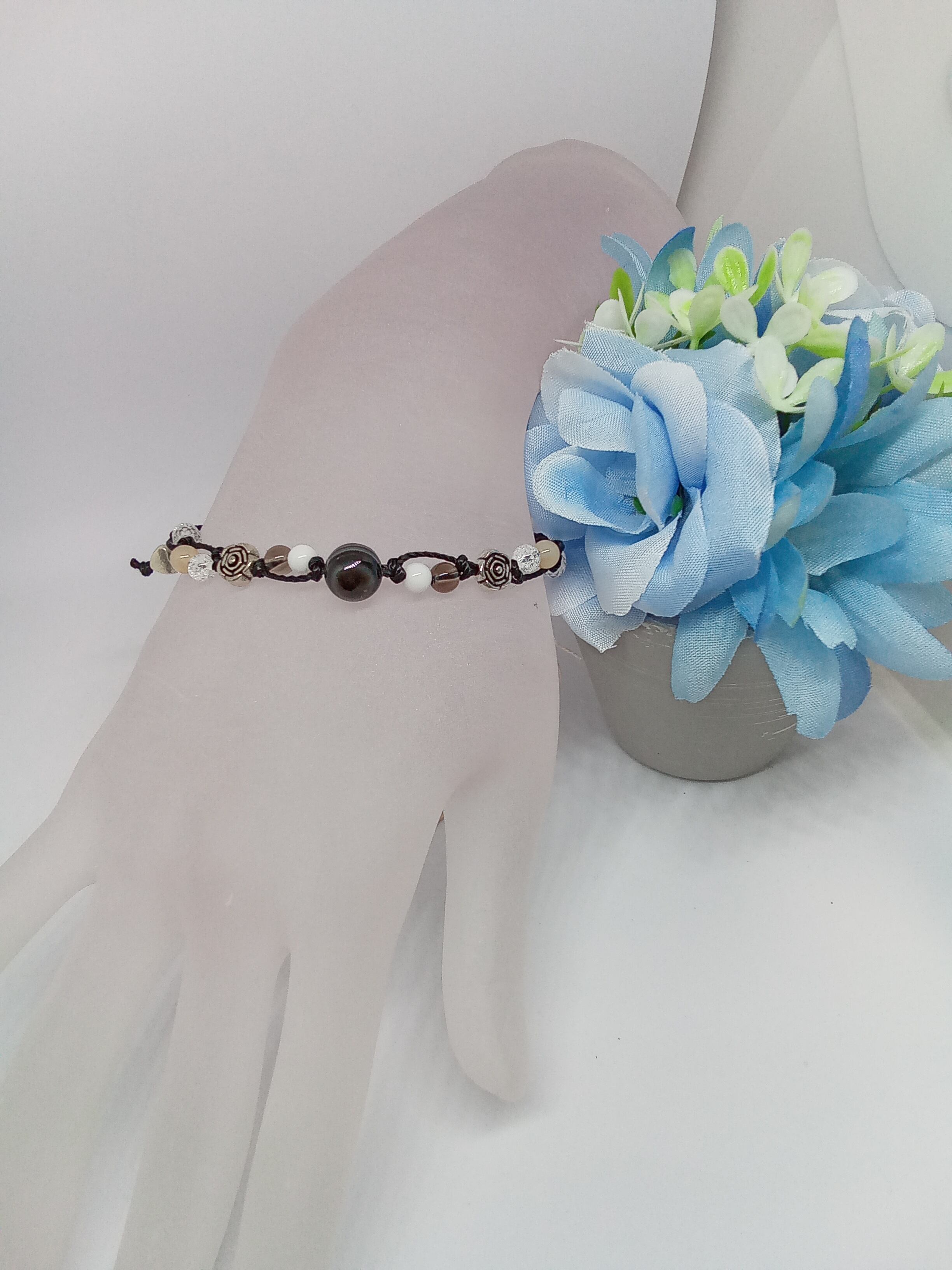 天眼石を真ん中に置き、周りを白や黄色のめのうで飾りました。